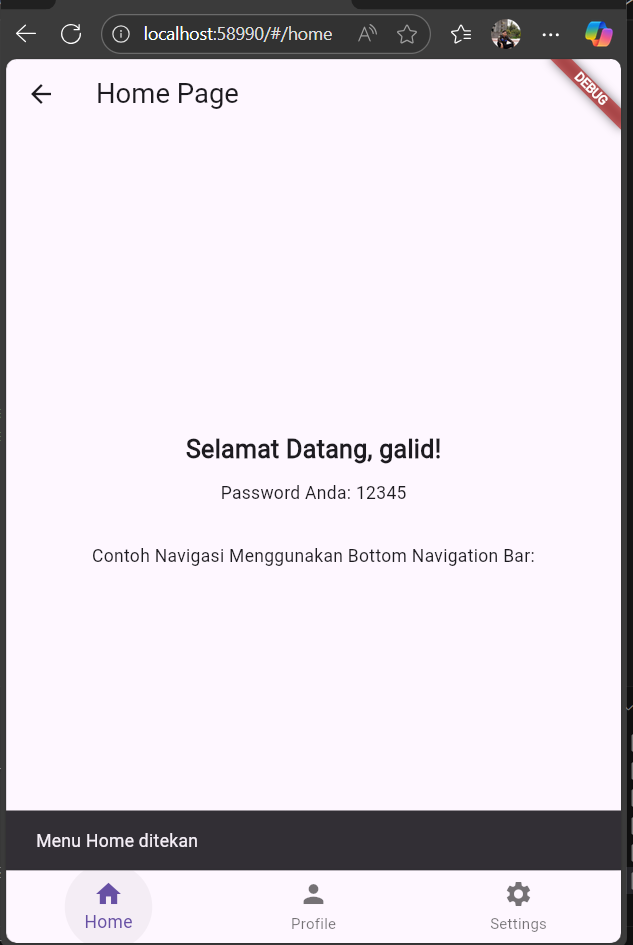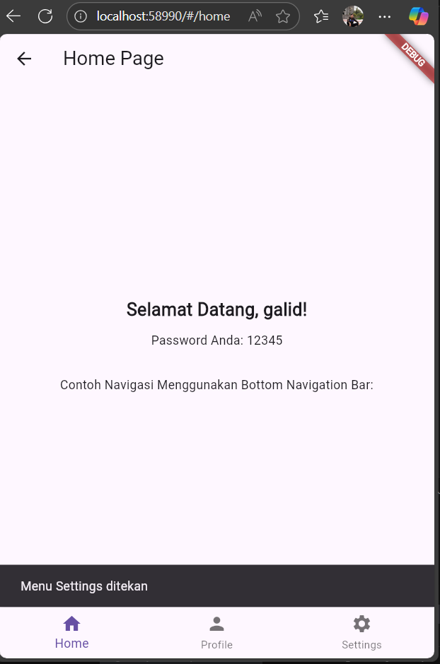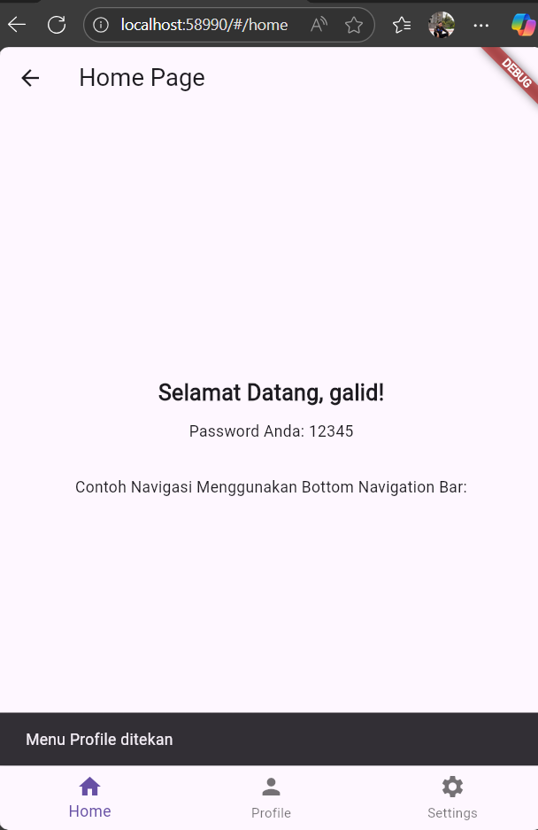 - Dari halaman Home ke halaman Profile, mengirim data seperti username dan ID pengguna..